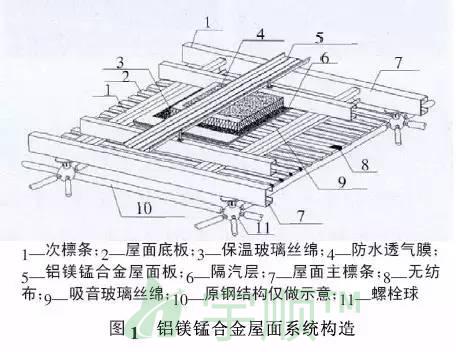 1.1 鋁鎂錳合金屋面系統(tǒng)構(gòu)造典型的鋁鎂錳合金屋面系統(tǒng)構(gòu)造,如圖1所示。