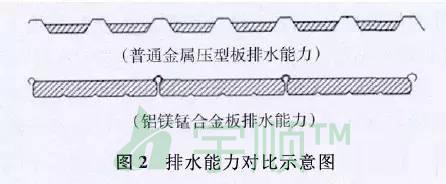 2)最大限度地利用面板橫截面積排水,排水效率高。與普通金屬壓型板排水能力對比,見圖2;