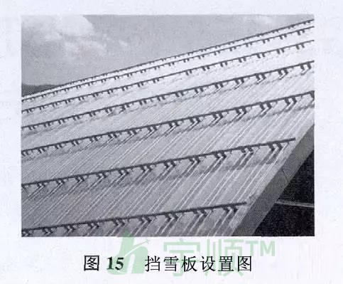 北方地區(qū)的屋面一般需要設(shè)置擋雪板。擋雪板材質(zhì)一般為不銹鋼或鋁合金。擋雪板可根據(jù)屋面的基本雪壓和坡度來布置。天溝及檐口上方必須設(shè)置擋雪板,擋雪板的設(shè)置見圖15。